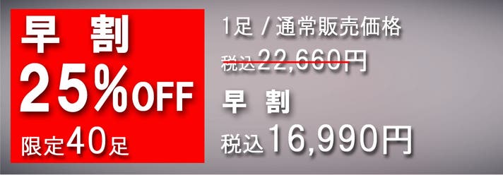(内訳)通常販売予定価格<本体>1足(税込)21,780円+送料(税込)880円=合計22,660円の25%OFF