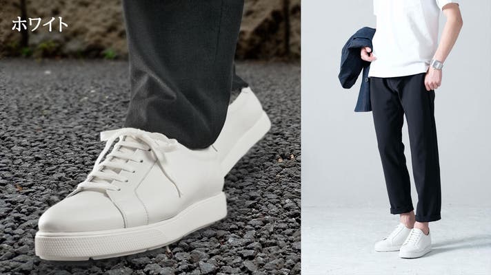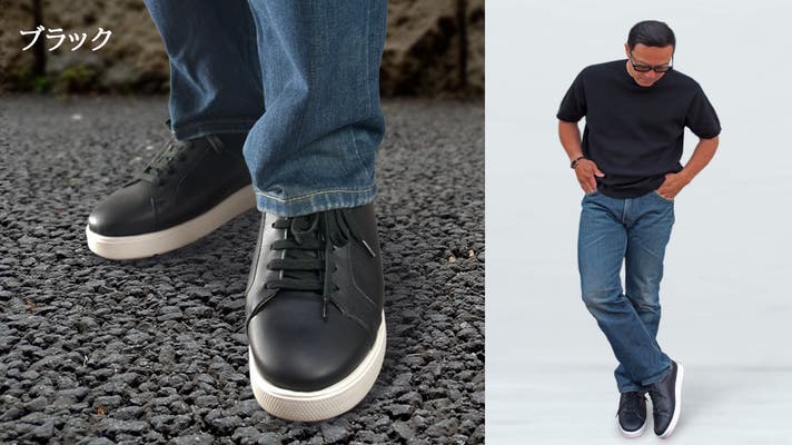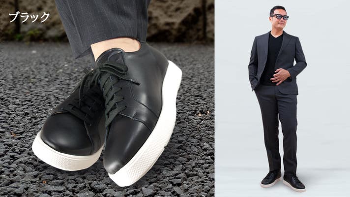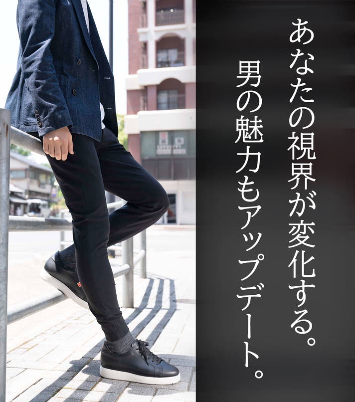 見た目はお洒落なスニーカーで外観からはヒールアップ構造と分からない。歩行性とスタイルアップを追求した股下約6cmアップの脚長スニーカーです。