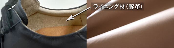 <ライニング素材>甲部裏素材は足当たりの良い豚革を採用。