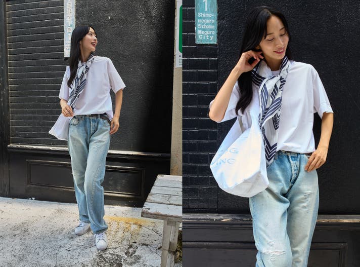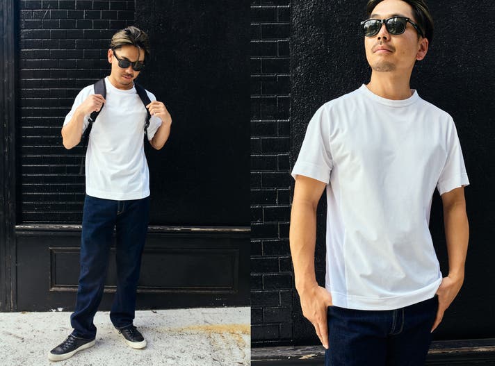 真っ白なTシャツにブルーデニム、ヨレていると白の爽やかさと清潔感が台無しになるため、ミライドTを手に入れたら是非試してほしいスタイルです。白Tはシンプルな分、体型が目立ちやすいと言われていますが、Vシェイプが体型を整えるため挑戦し易くなります。男性は白Tをジャストサイズにするなら上下ジャストよりもデニムパンツはゆったりがオススメです。女性は上下ともゆったりで柔らかいドレープが生まれることを意識すると成功します。