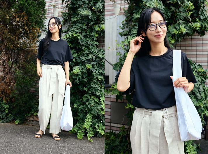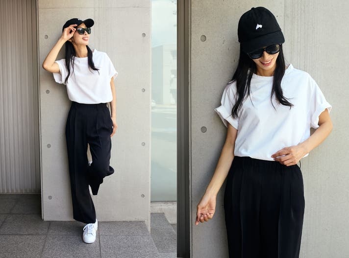 ミライドTが一番得意とするのが白黒のモノトーン。ありそうでなかった白x白(黒x黒)の配色が白と黒の平凡さに立体感をつくります。特に都会的なミニマルスタイルと好相性です。ここでもVシェイプがシスタイリッシュな印象を演出します。白黒で境界線がはっきりするため、ヨレにくい裾が活躍します。