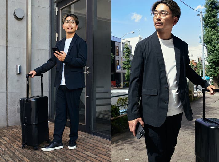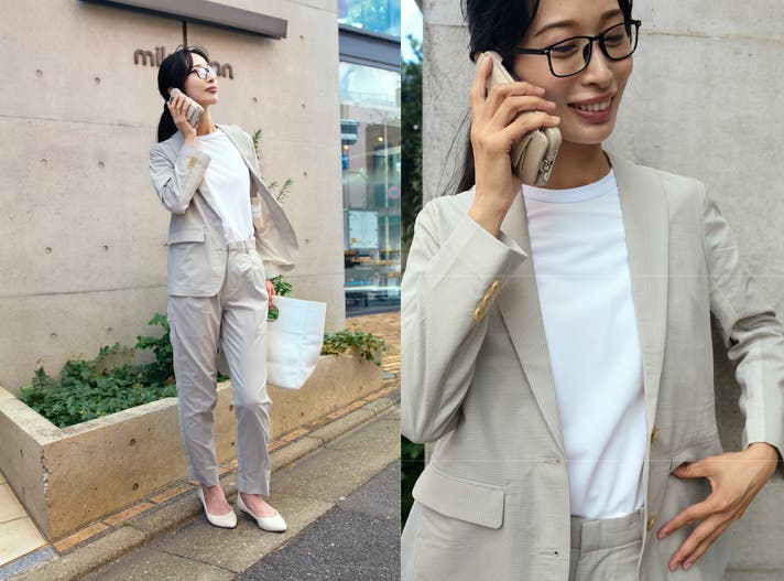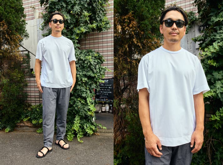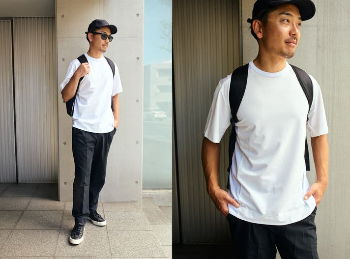通勤スタイルはデイリーで着て洗っても首周りが型崩れしないものが便利。襟が2層になったミライドTが得意とするところ。オフィスカジュアルでコットンのTシャツだとカジュアル過ぎちゃうけど、ミライドTはスムースな質感でフォーマルが得意。サイズはジャストサイズがオススメです。