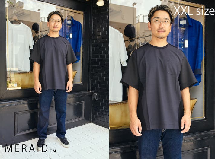 A:迷った時は大きい方をオススメしています。色々な方に形を検証していただき、いつもより少し大きめが落ち着くという意見をいただきました。普段Lの方がXLサイズを選んでもだらしなくならないよう、袖付けなどで細かい調整をしています。