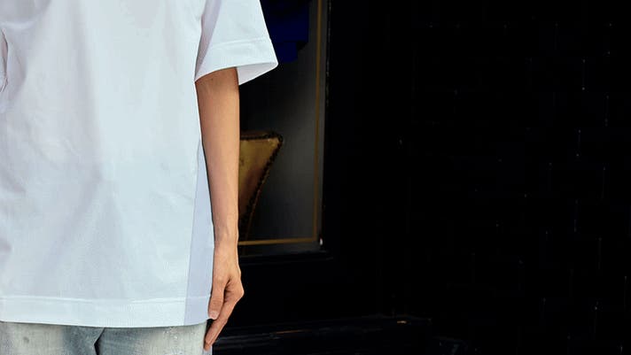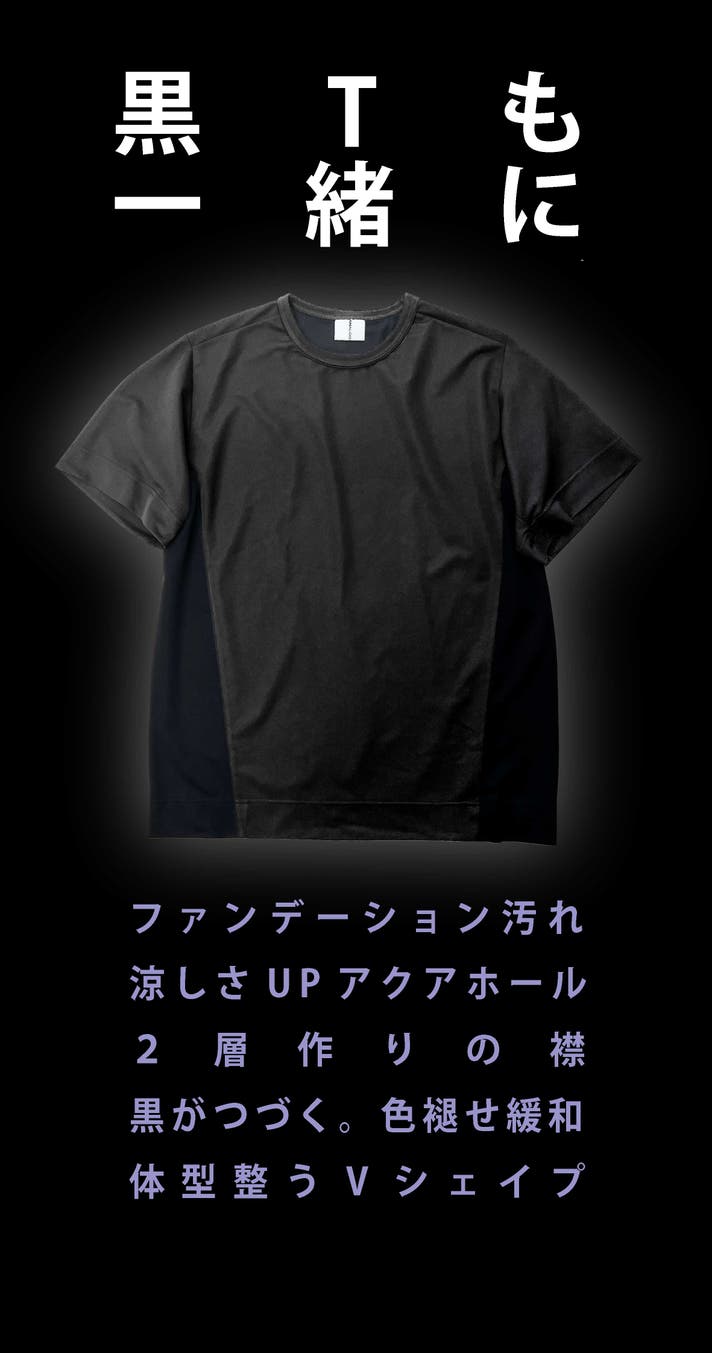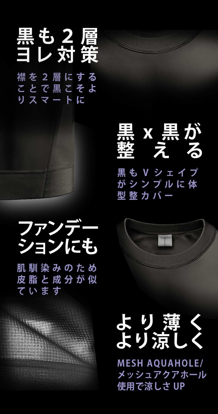 A:透けを考えると素材が厚くなり、涼しさを優先すると透けが気になるという矛盾があります。そのため透けが気になる前(と袖)は透け無し素材、後は透けが気にならない程度の涼しい素材を採用しました。黒は透けが少ないため、後ろには涼しさ優先した「メッシュ素材のAQUAHOLE/アクアホール」を採用しているため、より涼しく過ごせます。
