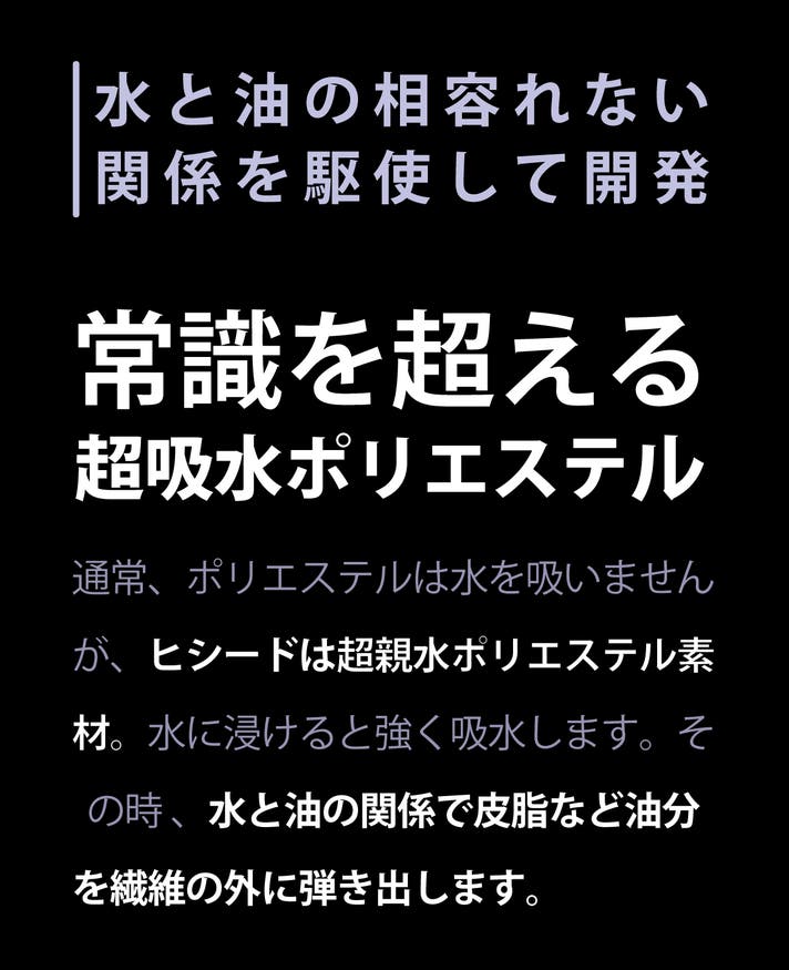 A:吸水します。ポリエステルは通常は釣り糸のような長い透明な糸(フィラメント)の束のため水を吸わない性質がありますが、ヒシード、アクアホールとも吸水性が有ります。「HYSEED/ヒシード」は超吸水機能、「AQUAHOLE/アクアホール」はコットンよりも優れた吸水拡散機能があります。