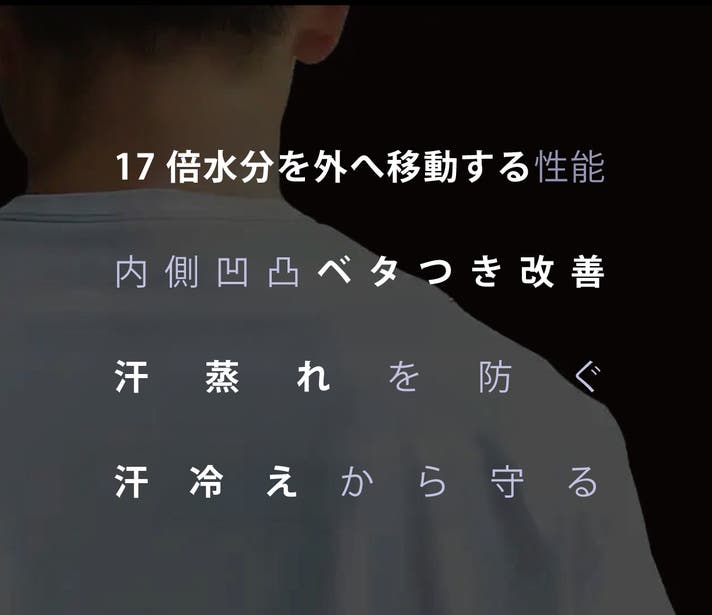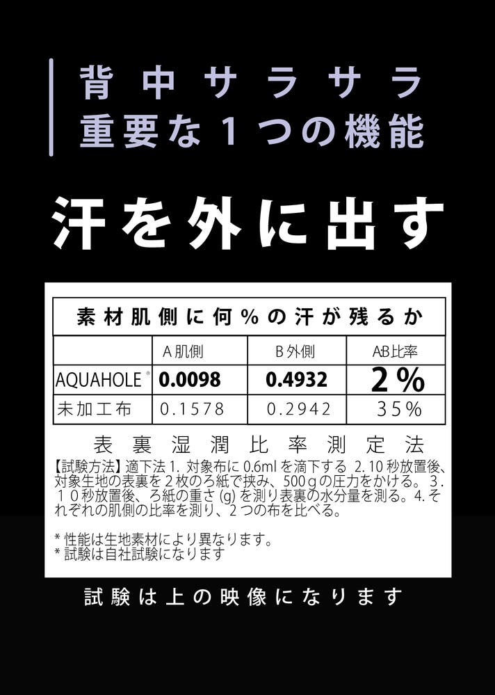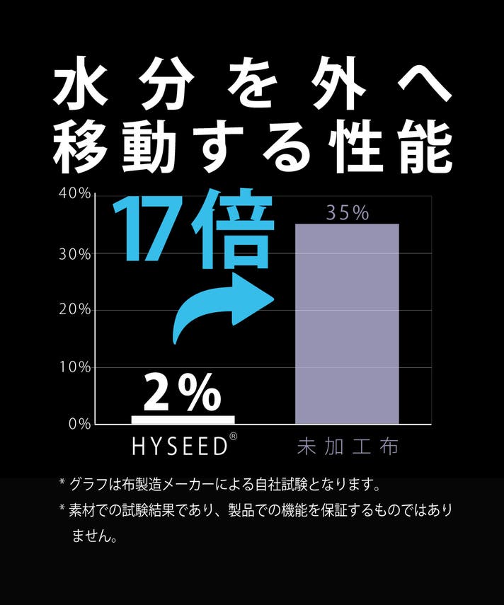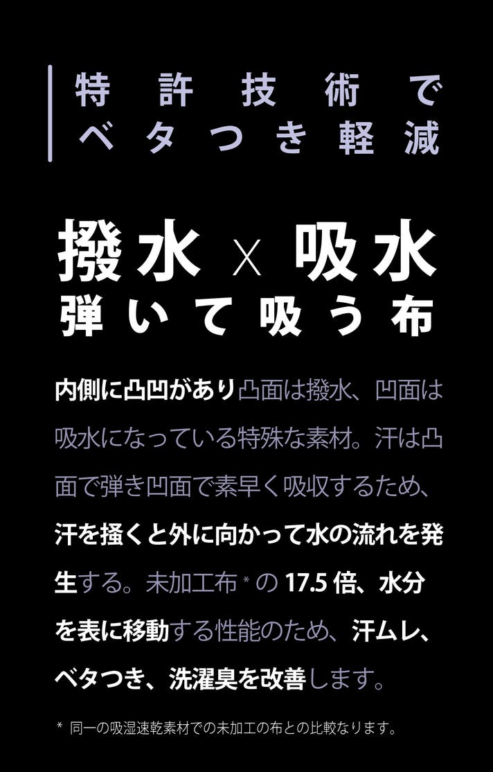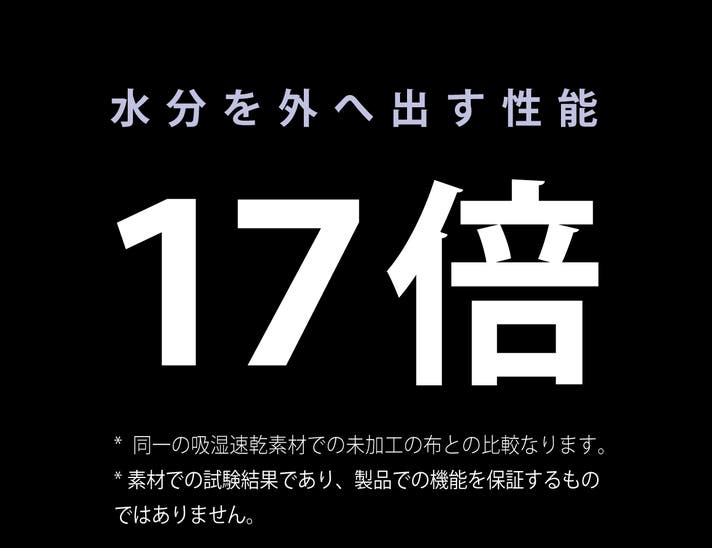 - 未加工布の17.5倍,汗などの水分を外へ出す、特許技術搭載