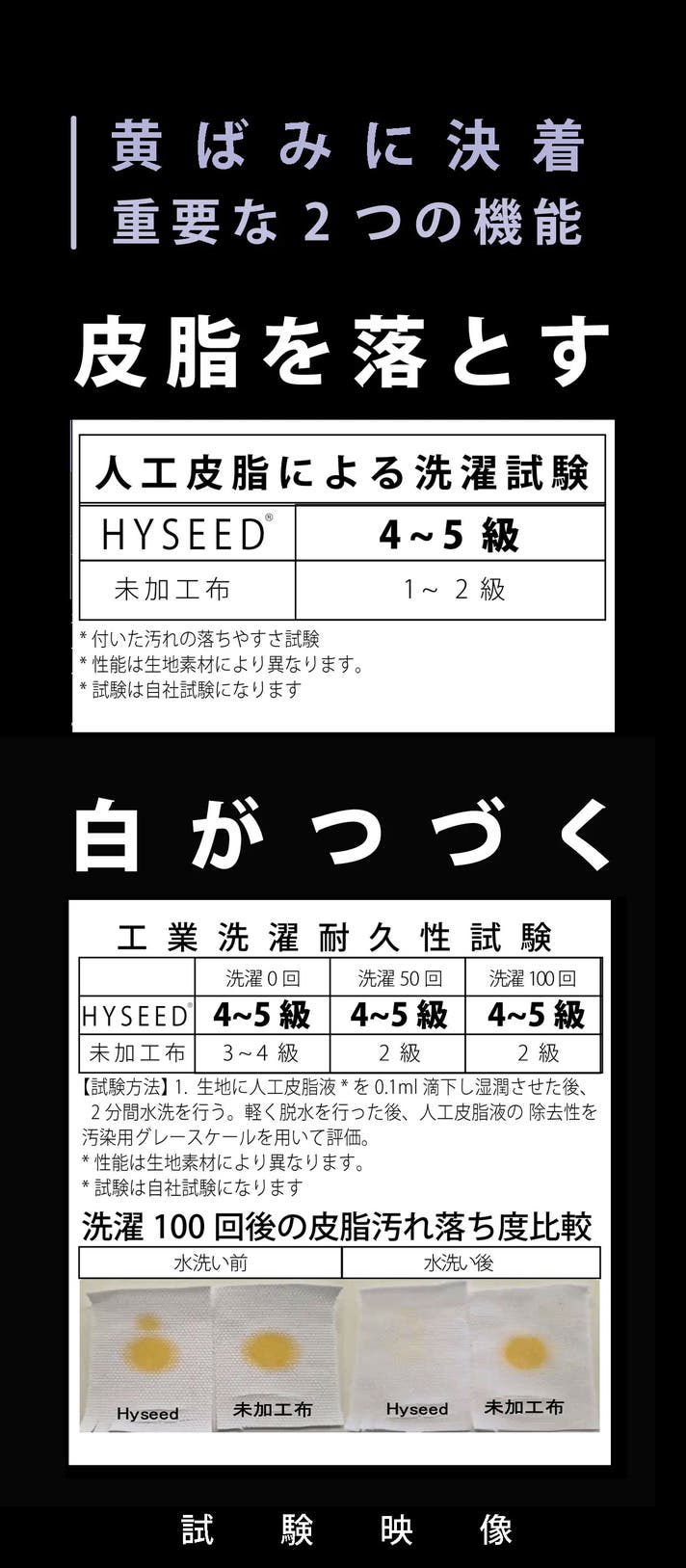 A. 黄ばみの主な原因は皮脂汚れと汗で、こちらは洗うことで落とすことが出来ます。しかし黄ばみにはそれ以外にも様々な要因や解明されていないこともあります。洗わないまま長期間放置したり、汚れた状態で保管すると落ちなくなる可能性があります。また特殊な状況では窒素酸化物(NOx)と長期触れ合う環境(石油やガスストーブ、車の排ガス)で化学反応を起こす可能性があります。あらゆる黄変を全て防ぐ商品ではありません。しかし黄ばみの主な原因は脂汚れと汗によるもので、HYSEED/ヒシードはそれを解消するものになります。