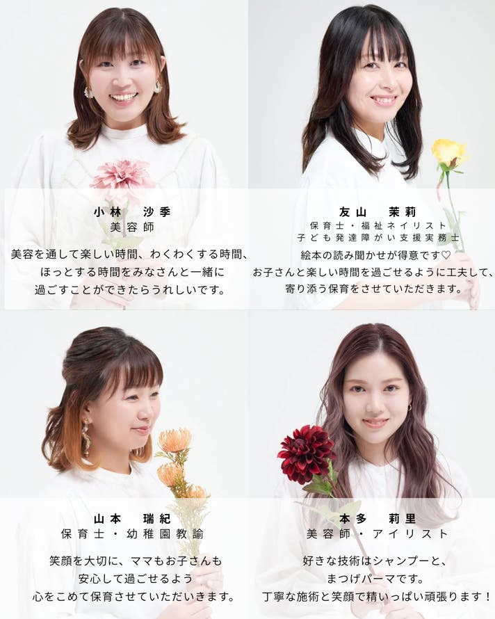 当店には、美容師の他に「保育士」「幼稚園教諭」「子ども発達障がい支援実務士」の資格を持つ子供のスペシャリストが在籍し、スマイルカットのサポートをしております。またスタッフ全員が現役の“子育て中のママ“。