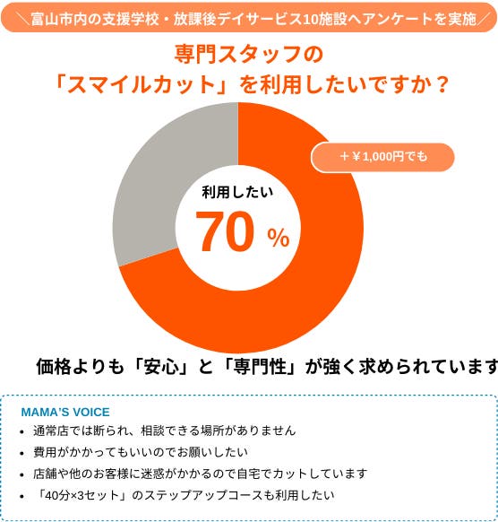 地域で悩みを持つ方々の解決策を形にするため、富山市内の放課後デイサービスなどでアンケート調査を実施いたしました。
