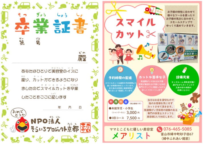 スマイルカットには卒業制度があり、1人で座ってカットができるようになると、卒業証書をお渡ししています。卒業すると、スマイルカットコースではなく、通常カットのメニューに変更となります。