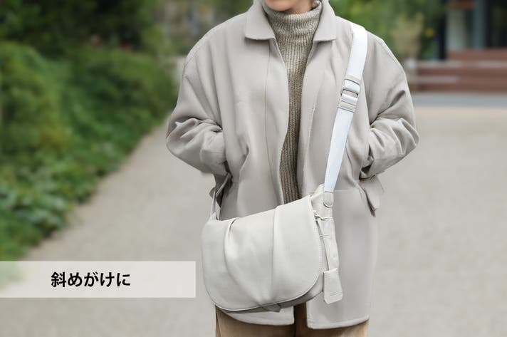 斜めがけはコートの上からでもゆったり掛けられる長さまで調節できます。