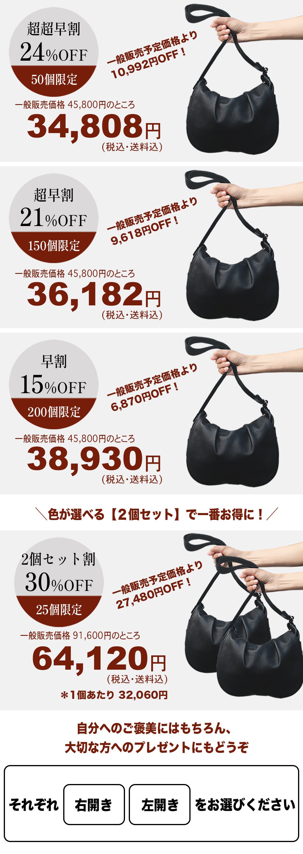 (2)左開き(斜め掛けの際、右肩にかけ、バッグ本体が左にくる方) より2個それぞれお好きな方をお選びください