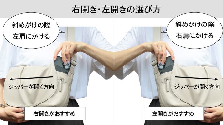 ショルダーバッグのジッパーの開き方向を、お好みに合わせて左右どちらかを選べます。