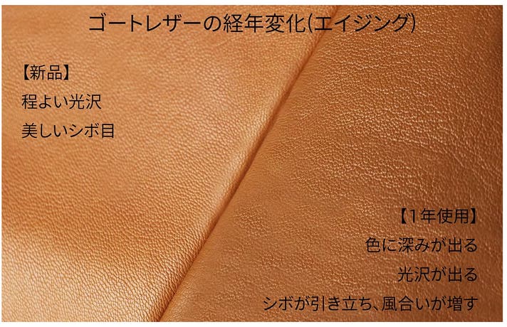 その手触りは、ゴートレザー本来の柔らかさを活かしつつ、しっとり、使うほどに艶が増す上質なレザー。