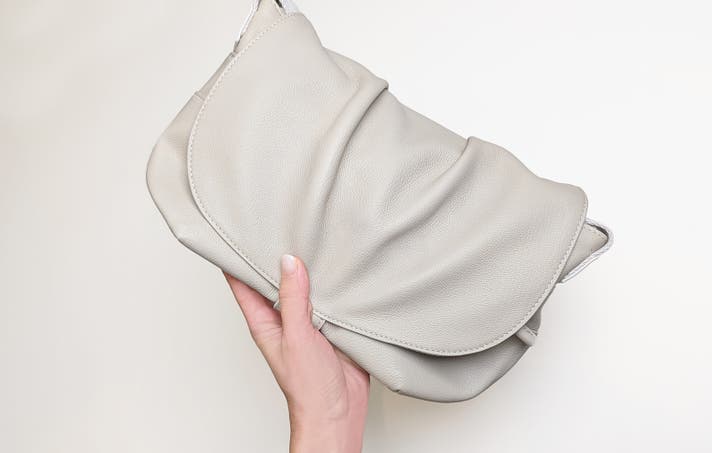 正面の2本のタックで立体感を出すことで、このスペシャルなレザーの確かなハリと柔らかさを魅せ、