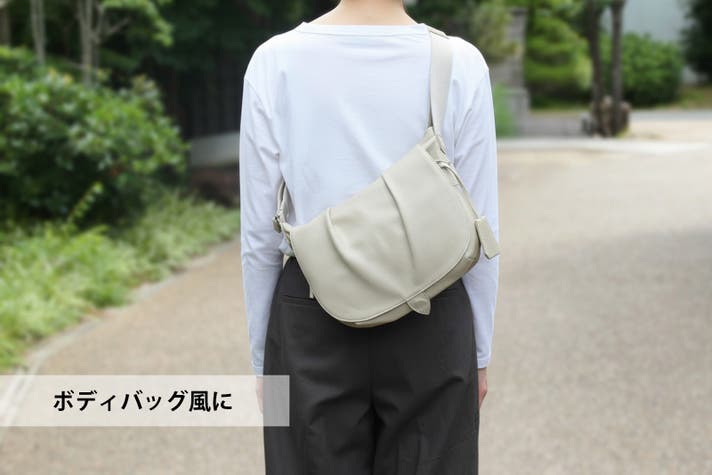 ボディーバッグ風の長さから、斜めがけまで、お好きな長さに調節できます。