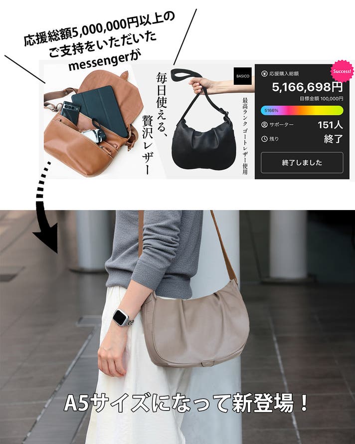 A. messenger piccolaは【応援総額5,000,000円以上】とたくさんのご支持を頂いたプロジェクト”messenger(メッセンジャー)”の機能性や収納力・整理力をベースに、より「普段使いに特化」した ”毎日にちょうどいい” サイズ感を求めてリデザインしました。