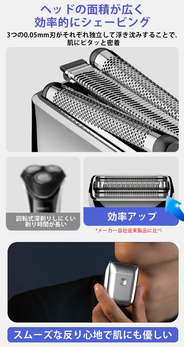 - 3連密着ブレードがひりつきを防ぎ快適なシェービング体験へ!