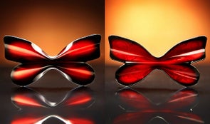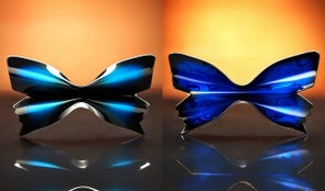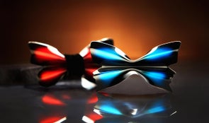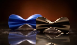 オーストラリア北東部からニューギニア、ソロモン諸島などに生息し、「幸せを運ぶ蝶」とも呼ばれるパピリオ・ユリシス(和名はオオルリアゲハ)をモチーフにした蝶ネクタイです。
