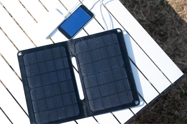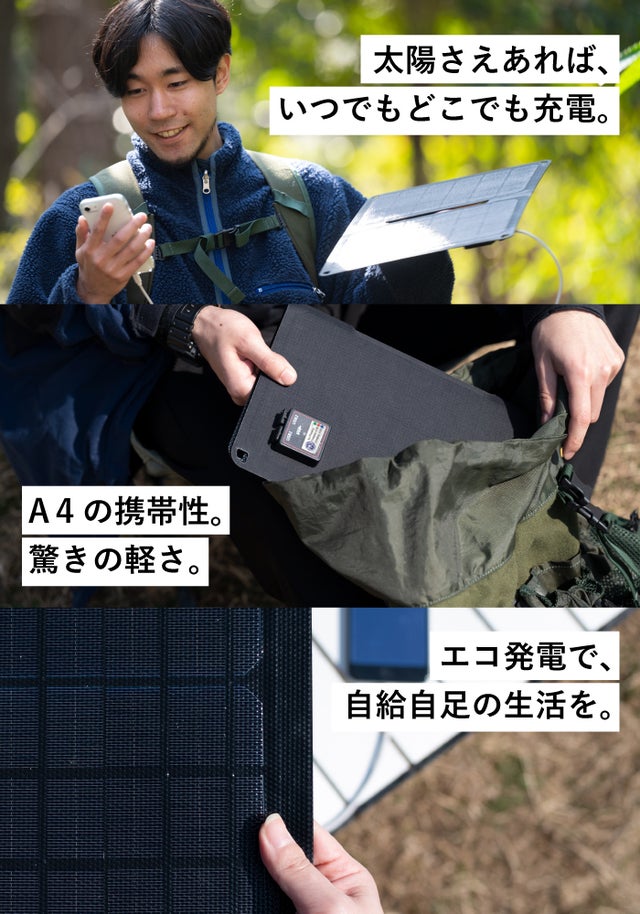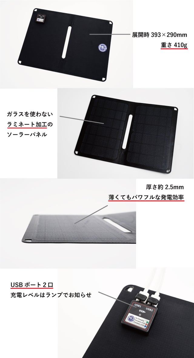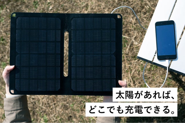 - 太陽さえあればどこでもスマホが充電できる、アウトドア時も持ち歩きやすい軽量仕様
