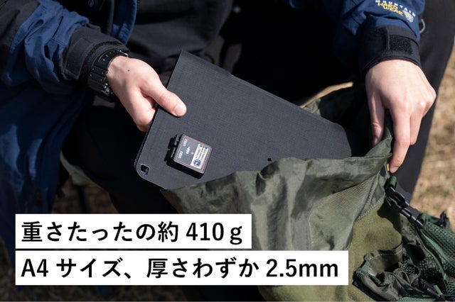 一般的なガラスとアルミフレームで作られた持ち歩ける太陽電池は、まだまだサイズが大きく、分厚く、重く、持ち運びも大変。それだけで1つ荷物が増えてしまいます。