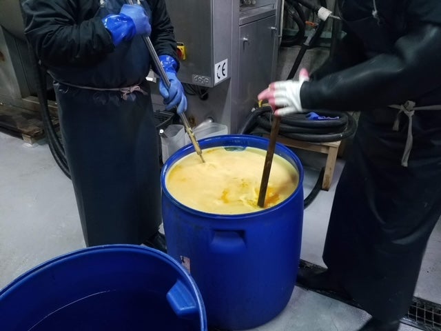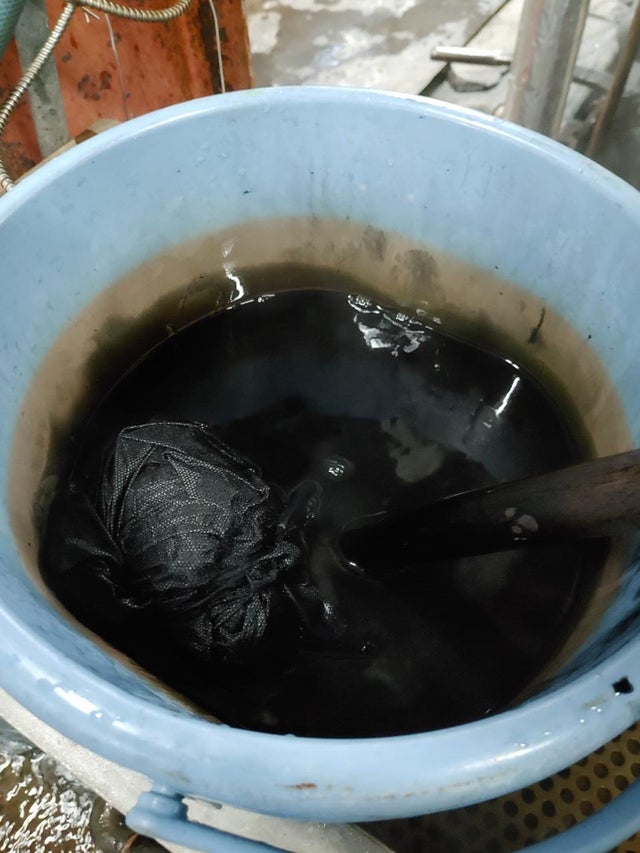 絞りを入れた皮革を染料のバケツに入れて染料が染み込むようにかき回す工程です。
