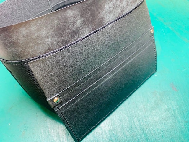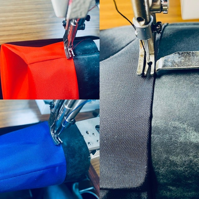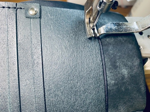 牛革製品より1工程増やさなければなりません。裏面に芯材となる材料を貼りこみ耐久性を持たせる工程がございます。この素材選びが完成品の良し悪しを決める大切な工程でもあります。硬い素材を使用すれば縫製工程では容易になりますが完成品では硬いゴワゴワした感触なってしまいます。柔らかな素材を使用すれば縫製工程・仕上げ工程では結構手間がかかりますが軽くなり・持った感触も柔らかく仕上げることが可能なのですが、、、量産品では、あまり見かけない手間のかかる作り方になります。