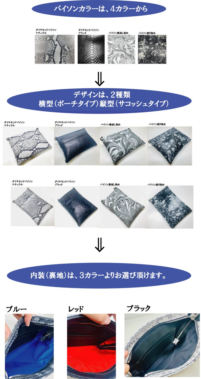 ※今回のプロジェクトでは、パイソンポーチが横型。パイソンサコッシュが縦型と呼ばせて頂いております。