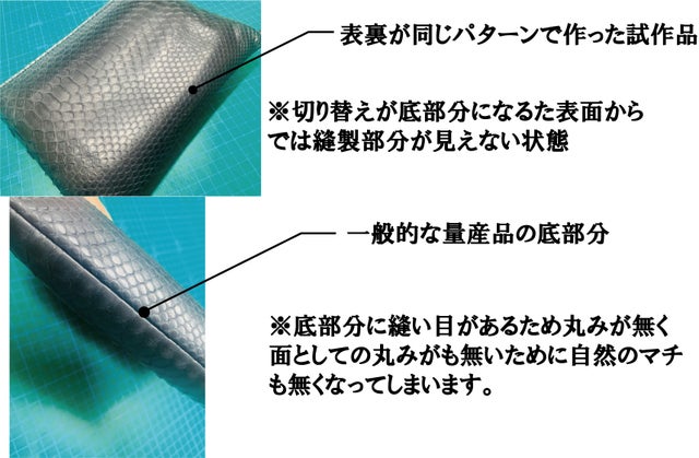 通常量産型の商品では、表面・裏面の型紙を同じにして底面に縫い目がある縫製方法が一般的になります。なぜなら?表裏が同じパターンの方が、裁断・裏貼り・縫製も手間が掛からず時間の短縮にもなるためです。