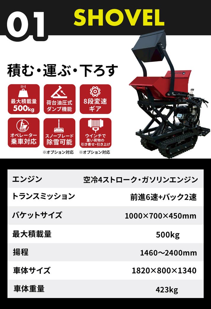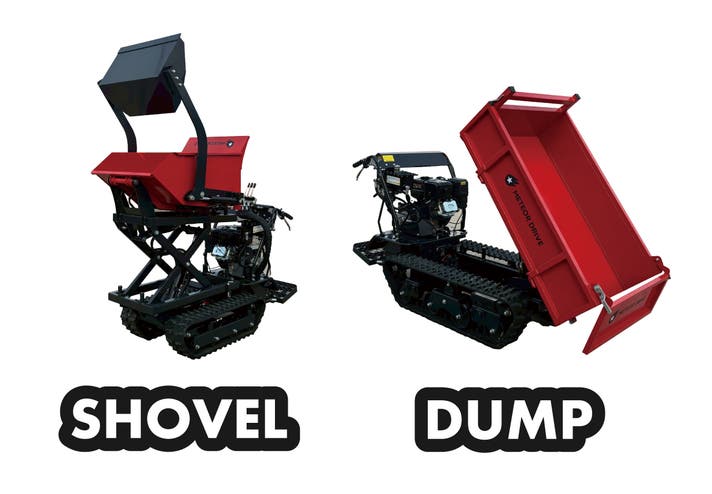 Shovel は2,400mmまでのバケット揚程で高所への積み込みを可能にし、Dumpは積載800kgまでの荷物を効率的に運搬・排出。