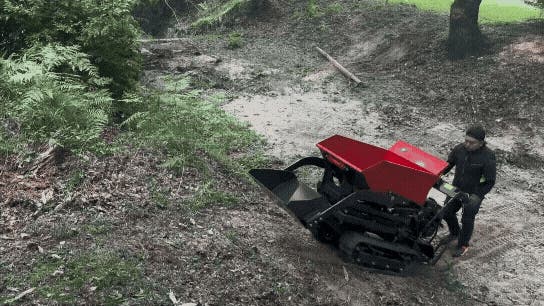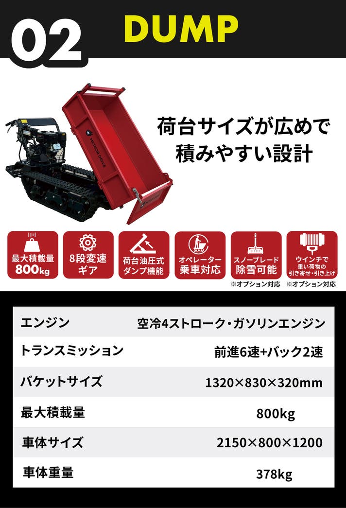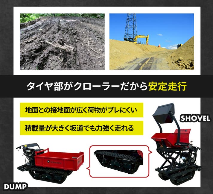 - クローラー車なら傾斜も段差も自ら走る!オプション装着で除雪や積み込み補助など多用途に変換!