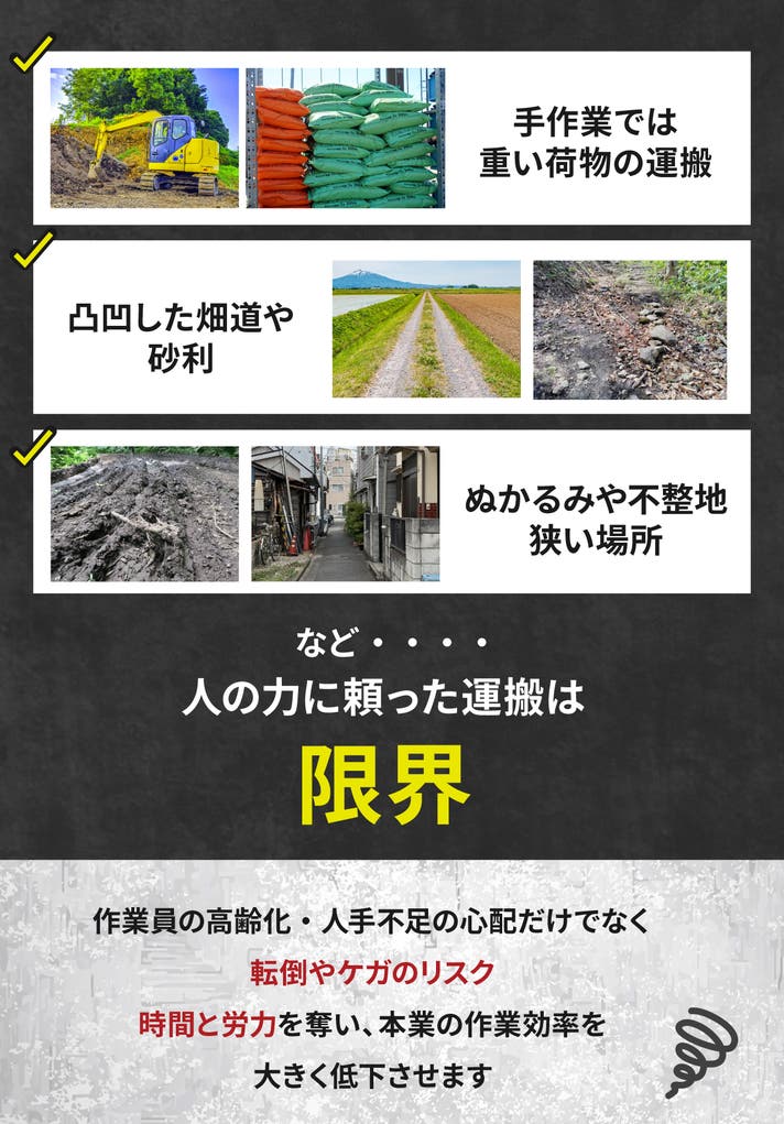 - 災害・畜産・農場・建設・公園など活躍のフィールドは無限大!「人力には戻れない」新時代の運搬車