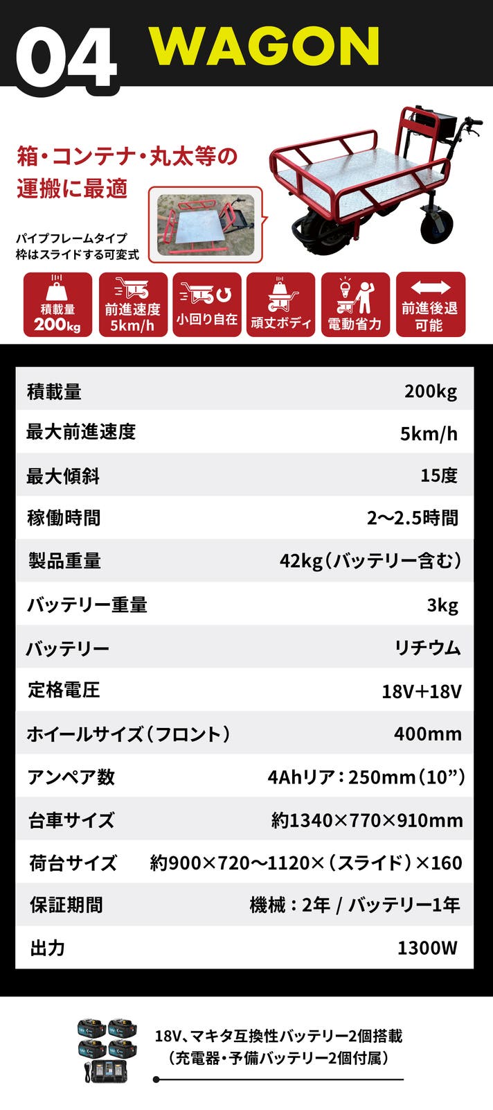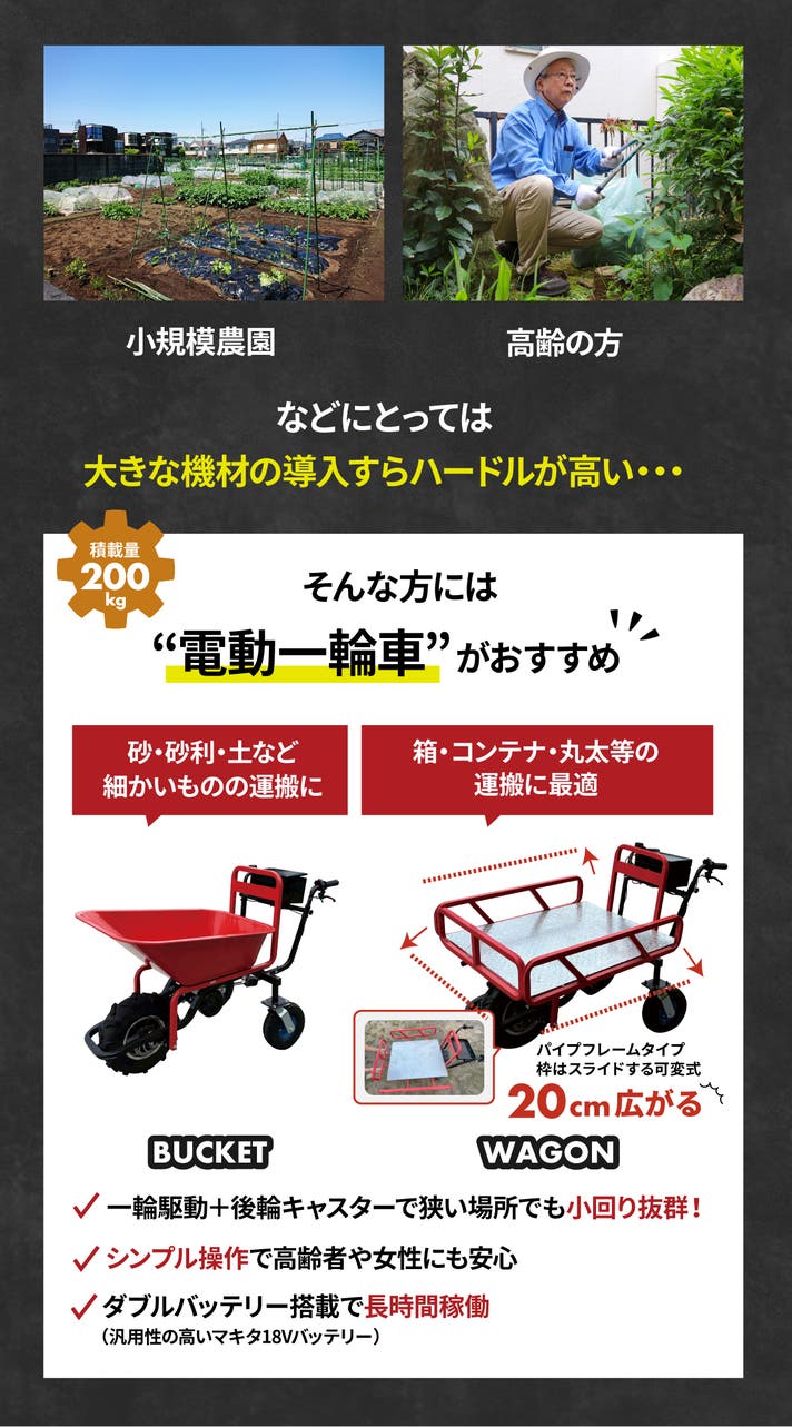 女性や高齢者でも扱いやすく、農作物・資材・収穫カゴなどの運搬がぐっとラクになります。長時間の使用にも対応できるダブルバッテリー仕様、しかも予備バッテリーも2個付属。