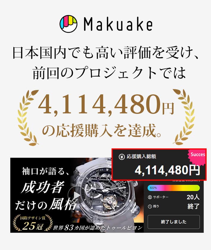 リターン品の配送が完了するまで、LUNERA(ルネラ)はAGELOCER(エイジローサー)の日本における独占販売権を有する正規代理店です。詳細に関しては、ページ下部のリスク&チャレンジをご確認ください。