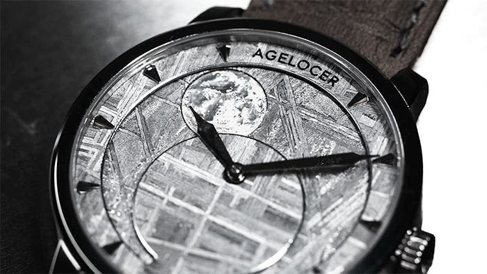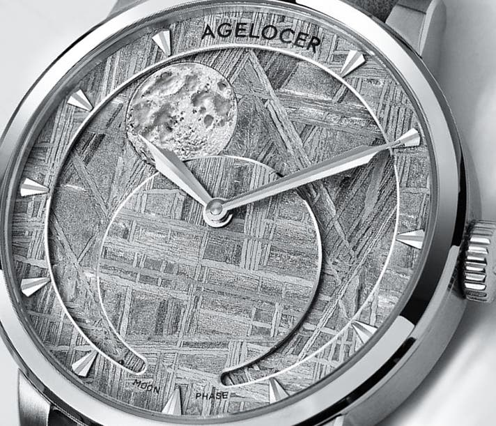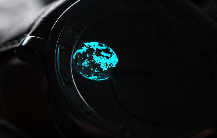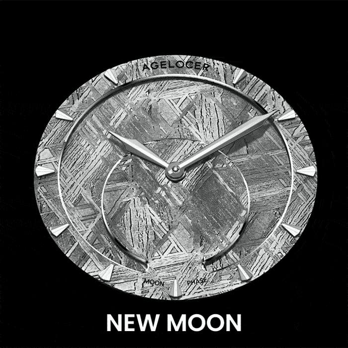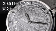 従来のムーンフェイズは、文字盤の一部に設けられた小さな窓から表示するのが一般的でしたが、AGELOCERは、直径28.5mmの大型パノラマウィンドウを新たに設計。