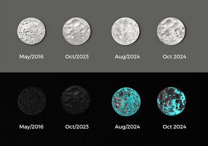 暗い所では柔らかい光を放ち、月の満ち欠けがより神秘的に浮かび上がります。