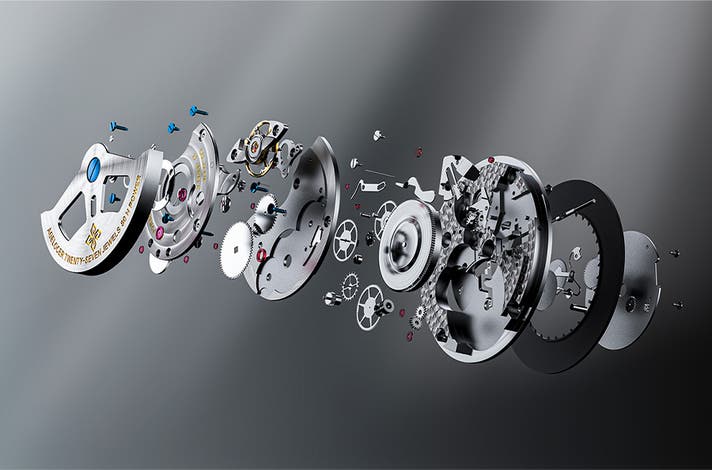 このムーブメントは27個のルビーベアリング、ロジウムメッキ仕上げのムーブメント、ポリッシュ仕上げのエッジ、ブラッシュ仕上げの面取り、精緻なコート・ド・ジュネーブ装飾、サンバースト模様、金文字の刻印、ブルーのネジ、鏡面研磨されたネジ頭が特徴です。