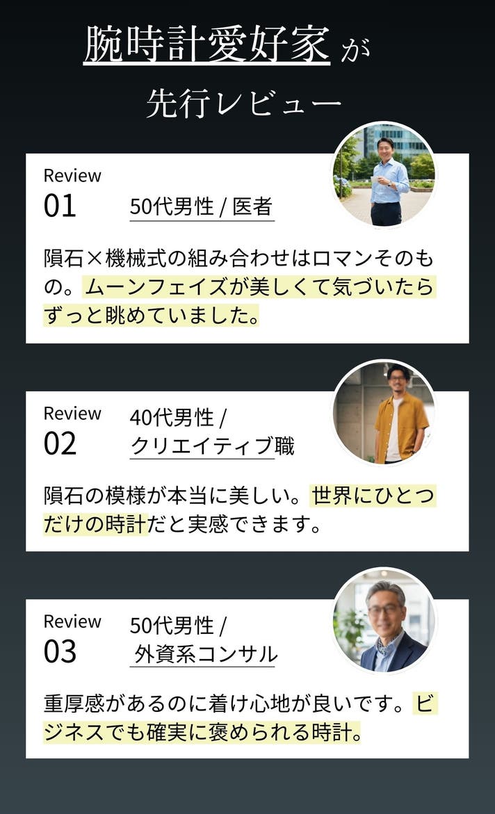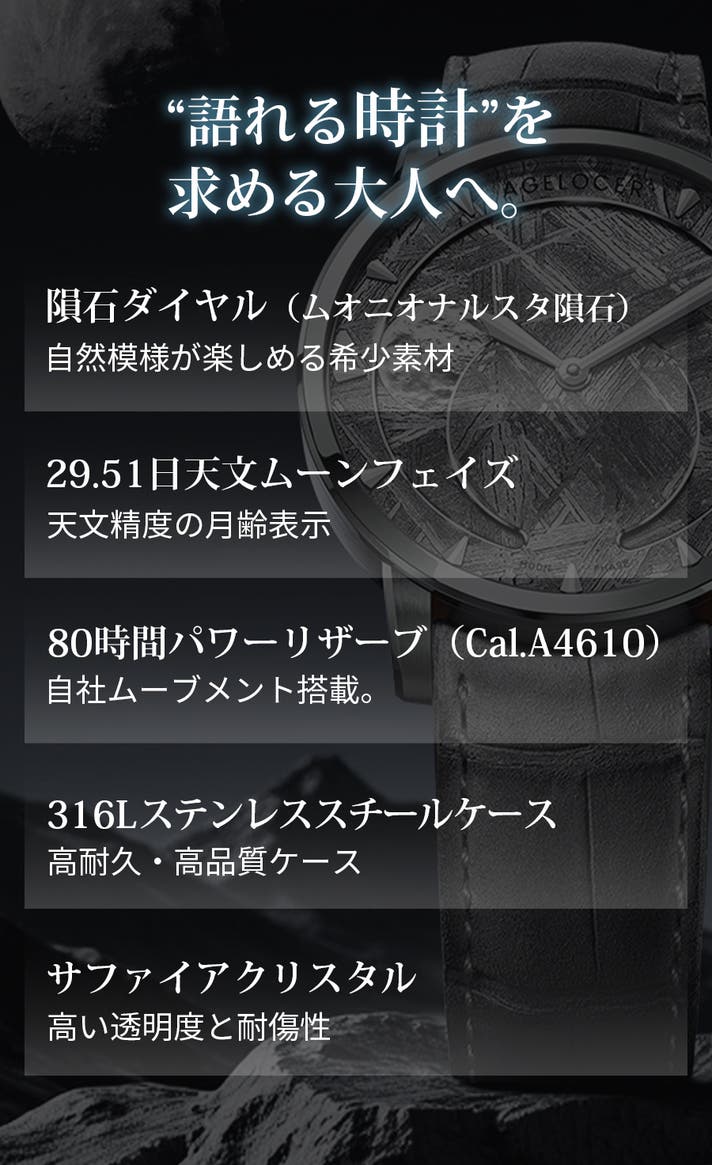 隕石ダイヤル×ムーンフェイズの神秘的な表情に、繊細な光の輪が加わることで、ビジネスにもフォーマルにも映える“格上げモデル” としてお楽しみいただけます。