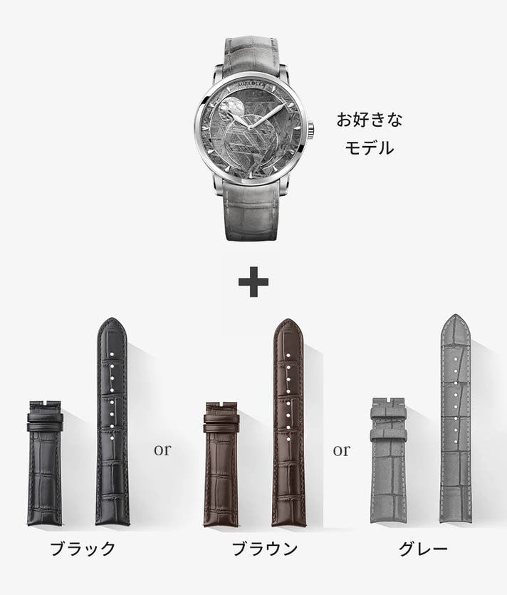 さらに上質を求める方のために、希少なアメリカンアリゲーター革へのアップグレードをご用意しました。腕元を一段上のラグジュアリーへ導く、コレクション級のプレミアムストラップです。※予備ストラップをアリゲーター革にアップグレードします。