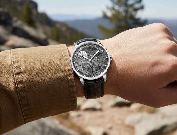薄明かりの中でこそ映える、ムーンフェイズの柔らかな光。隕石の輝きとともに、手元が大人の余裕をさりげなく演出します。