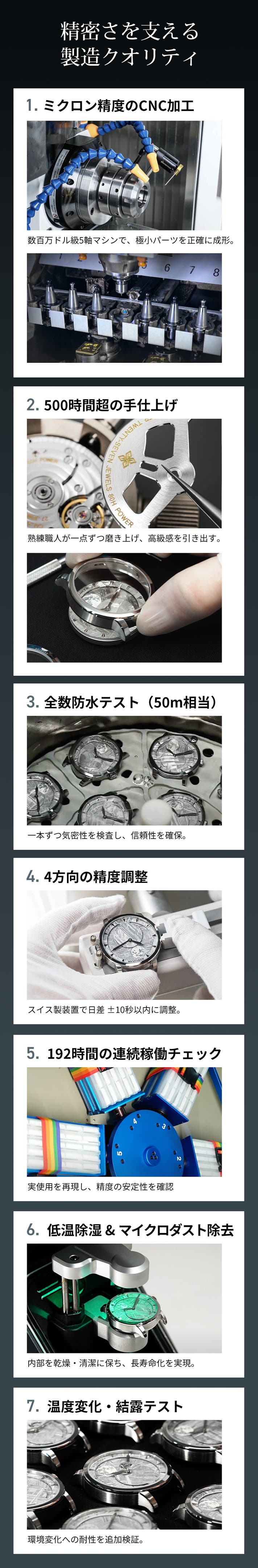 A. 全数検査、50m相当の防水試験、4方向精度調整、192時間の連続稼働チェックなど、複数工程で品質を確認しています。