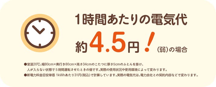 1時間あたりの電気代:(強)約7.8円/(弱)約4.5 円