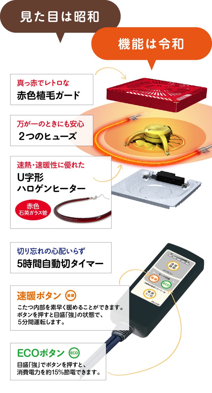 ヒーター・布団・テーブル、すべてが国内生産のメイド・イン・ジャパン仕様。