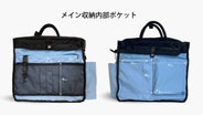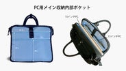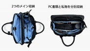 バッグのメイン収納(3層目と4層目)は、マイボトルなど私物を入れる大容量スペースと、PCや書類を収められるブリーフケース風のビジネス向けスペースの 2層構造。用途に合わせてすっきり分別して収納できます。