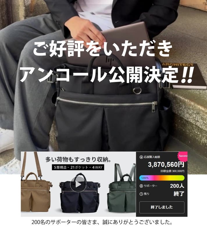 「Makuake(マクアケ)」は、実行者の想いを応援購入によって実現するアタラシイものやサービスのプラットフォームです。このページは、 プロダクトカテゴリの 「【アンコール】5層21ポケット搭載!PC書類と私物を分別。自由自在な多機能バッグ」プロジェクト詳細ページです。