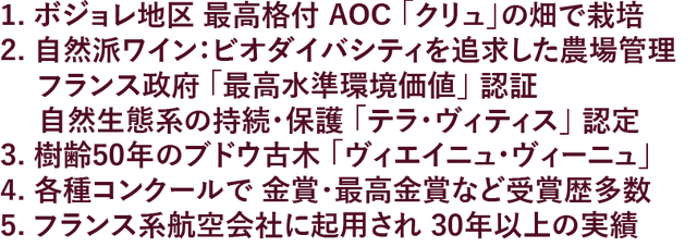 すべてがクリュと同環境で造られたシャルドネの逸品。ボジョレでは希少な白。輝き透き通る琥珀色、華やかな美しさと雑味の少ない適度な酸味とシャルドネの爽やかな芳香。フランス国内外から高評価を博し品薄状態。金賞受賞。