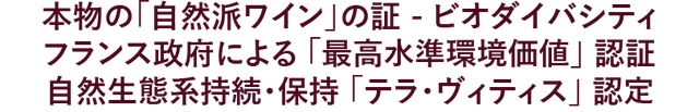 また、併せて、ほぼ同内容の審査で評価する「TERRA VITIS テラ・ヴィティス」の認定も受けています。「本物の自然派ワイン」としてご紹介する証です。