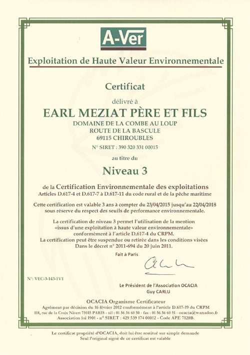 メジア社が粛々と続けるワイン造りは、ビオダイバシティ、生物多様性の保護、自然生態系維持・持続性、自然の状態における地中を流れる水の治水管理、その他に加え、防疫・植物検疫などの現代的衛生管理を徹底し、フランス政府機関が管理監督する、醸造施設も含めた農場全体を審査対象とする環境価値基準で最高位となる HVE「最高水準環境価値」に認証されています。