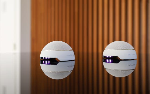 2つのスピーカーがマグネットでピタッと合体し、美しく人工的な球体に。