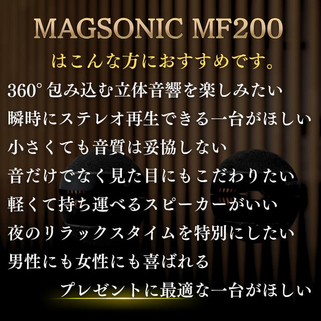 2025年11月、新たに登場した2in1惑星型スピーカー『MAGSONIC MF200』の特長のひとつが、独自開発の半球形デザインが生み出す、圧倒的没入サウンド。